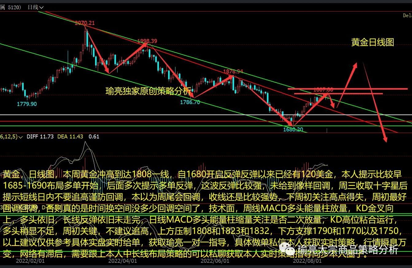 黄金,日线图,本周黄金冲高到达1808一线,自1680开启反弹反弹以来已经有120美金,本人提示比较早1685-1690布局多单开始,后面多次提示多单反弹,这波反弹比较强,未给到像样回调,周三收取十字星后提示短线日内不要追高谨防回调,本以为周尾会回调,收线还是比较强势,下周初关注高点得失,周初最好回调回调,否则真的是时间换空间没多少回调空间了,技术面,周线MACD多头能量柱放量,KD金叉向上,多头依旧,长线反弹依旧未走完,日线MACD多头能量柱缩量关注是否二次放量,KD高位粘合运行,多头稍显不足,周初关键,不建议追高,上方压制1808和1823和1832,下方支撑1790和1770以及1750,以上建议仅供参考具体实盘实时给单,获取瑜亮一对一指导,具体做单私信本人获取实时策略,行情瞬息万变,网络有滞后,需要跟上本人中长线布局策略的可以私聊获取本人实时策略指导同步本人圈子。 ​ 文/黄瑜亮(396840385)