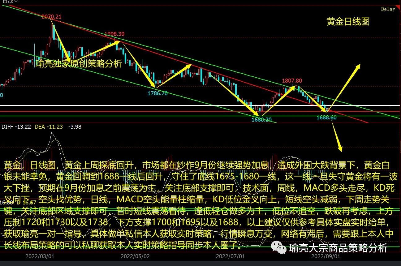 黄金,日线图,黄金上周探底回升,市场都在炒作9月份继续强势加息,造成外围大跌背景下,黄金白银未能幸免,黄金回调到1688一线后回升,守住了底线1675-1680一线,这一线一旦失守黄金将有一波大下挫,预期在9月份加息之前震荡为主,关注底部支撑即可,技术面,周线,MACD多头走尽,KD死叉向下,空头找优势,日线,MACD空头能量柱缩量,KD低位金叉向上,短线空头减弱,下周走势关键,关注底部区域支撑即可,暂时短线震荡看待,逢低轻仓做多为主,低位不追空,跌破再考虑,上方压制1720和1730以及1738,下方支撑1700和1695以及1688,以上建议仅供参考具体实盘实时给单,获取瑜亮一对一指导,具体做单私信本人获取实时策略,行情瞬息万变,网络有滞后,需要跟上本人中长线布局策略的可以私聊获取本人实时策略指导同步本人圈子。 文/黄瑜亮(396840385)