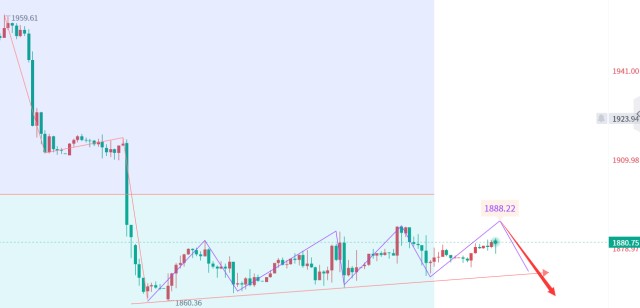 从MACD指标来看,经过几天的震荡之后,快慢线已经慢慢的靠近零轴,虽然还有一定的距离,但是空间不大,预示着留给金价反弹修正的时间已经不多了,近两天需要重点注意修正结束,开启下行的可能。操作上秦氏金升建议继续关注1880-1885的压制情况,意外情况则是关注强阻力1900的压制,整体保持看跌思路,注意行情近期下破的可能。小时图上,目前行情依旧处在预期的下跌中继通道内运行,只不过通道更加的横向,震荡区间更加的窄,这也就说明当前多空双方僵持之下无从选择的状态。导致这种现象的原因一是因为黄金自身有回弹需求被积压,二是美指目前状态也对黄金构成了不小的影响。日内黄金继续先保持看区间震荡状态,只不过今明两日黄金出现异动走势的风险会加大。