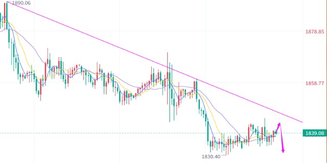 上周是震荡上行,本周是震荡下行,虽有重大数据但并没有令金价大幅下跌,回落也只是悠哉悠哉的,那么显然1830在零售数据强劲情况下都没有下跌,势必短期支撑有效,未来短期也倾向于反弹,只是反弹多少的问题,但当前仍是空头趋势之下,反弹第一想到的就是要做空,介于此,个人认为上方阻力1842/42以及1890、1870阻力点压力线位1853/55一带还是需要关注的。因此今晚思路泽熙洲建议反弹空,1842-43小仓位先空,1855一线再加仓空,破1860止损,目标依次1830、1820及1805。
