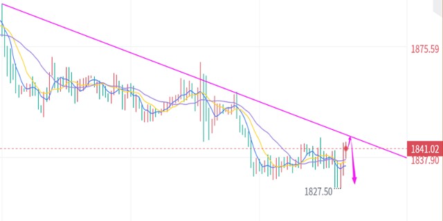 四小时综合技术指标处于空头形态,布林轨道再度张口,依然保持向下倾斜,顾比复合均线短线组发散,与长线组同时处于空头排列。今日反抽依托1845一线阻力继续顺势主空下看回落,上方第一压力位1843-45,强阻压制也是近期空头极弱分水岭1850关口,只要日线级别收盘未能突破并站稳1850关口,任何反抽均是做空机会,保持顺势主空节奏不变;综合来看今日黄金短线操作思路上泽熙洲建议反弹做空为主,回调做多为辅,上方短期重点关注1843-1845一线阻力,下方短期重点关注1800-1796一线支撑。