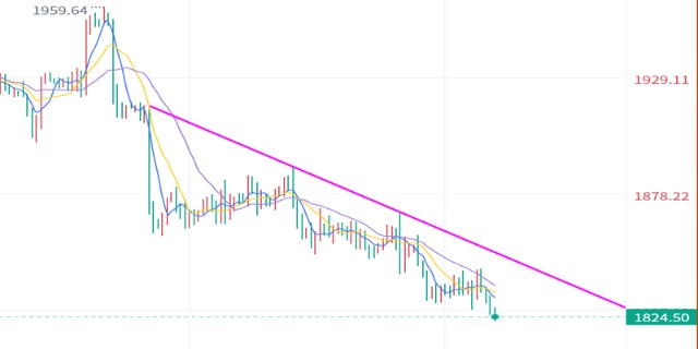 周图显示黄金1615三底上涨,连涨13周;1959见顶下跌,目前是第三周,所以跌势不会那么快结束。另外,从幅度上来看,1615上涨1959见顶,涨幅344美金,而现在调整不过120美金,幅度上也欠缺。并且,美元上涨刚刚启动, |