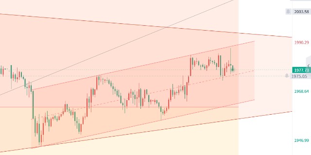 今日上午给出策略1975-1971的多单,晚间行情给到1987一线多单获利10个点离场,而后又再度下挫。盘面上来看,黄金整体是一个三角震荡,但是小时线级别出现通道向上的趋势,在行情突破1975之后,整体围绕通道中轨与上轨之间运行。尾盘操作建议还是保持此区间高沽低渣即可。