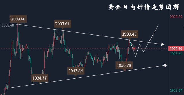 黄金昨日早盘低开急跌,最低触及1949.5后随即展开反弹,截止尾盘最高给到1990-线,收盘在1985一线,这样的走势过后,那么黄金大结构上多头趋势得以维持,短线上处于三E角震荡收敛。