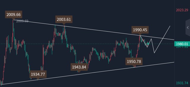 黄金昨日早盘低开急跌,最低触及1949.5后随即展开反弹,截止尾盘最高给到1990-线,收盘在1985一线,这样的走势过后,那么黄金大结构上多头趋势得以维持,短线上处于三E角震荡收敛。大结构上:从日线级别、周线级别来看,黄金目前仍然处于非常明显的多头趋势,周线级别处于1616三底支撑的大级别反弹中,日线级别处于1805这波多头的.上涨结构中,后市仍具备强势上涨基础。短线上:目前黄金走的是三角震荡收敛,以2009-2003-1990构筑上沿线、1934-1943-1950构筑的下沿线为收敛区域震荡,一般在收敛区域的末端才是真正走出方向的时候,目前已经非常接近震荡尾部,也就是黄金即将走出新一轮方向。【官微:qmz561 公众号:覃铭洲】目前仓位上有单的朋友,由于笔者不知道你们套单的点位以及仓位的详细情况,不好给出相应的解套策略,需要解套的可加覃铭洲。