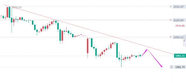 黄金价格昨天收盘价格1991整体走跌16个点,高点是早盘低开反弹2006的位置,低点是美盘下跌至1981的位置。昨天的2000实盘空单,与美盘分析反弹1995附近空单获利二十余点止盈离场。今日操作还是延续反弹做空的策略,等待金价反弹1995-2000再去做空金价,止损2004附近,目标下看1980附近。