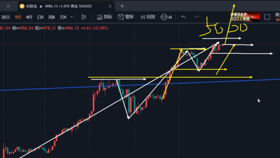 本周强势慢涨,从4600到周五接近5000的位置,涨幅将近400美金,仅仅只用了五天。那么在周五我就强调过,黄金在4550上下不能追高,要等4905—4890区域再去考虑北上