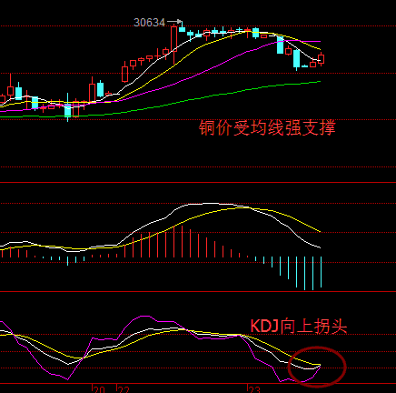 铜方面:铜昨日高开高走,下午亚盘有所回落,而后继续加速上涨,接近欧盘间到日内高点30634.而后一直小幅整理,并无大的突破。日线图来看,铜继续收阳,且均线均上行,KDJ也上行发散。本人认为今日铜方面,仍然可以继续以多为主。