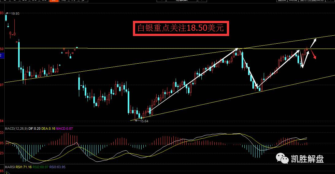 原油方面,美原油冲高回落的小时线走势也最终让昨日的日线完美收录一个带上引线小阴柱,那么短期而言,原油终于迎来强势上行一个回落时期,而昨日的收线也近乎持平前日的探底支撑部位,且结合到日线的主图形态中恰巧也是在触及MA5均线后的支撑反弹;但是和MA10相对应的金叉形态依旧是强势上行,MACD指标也依然是一个金叉上扬的走势迹象。 因此就势头来说,凯胜认为原油的势头依旧是一个多头表现,昨日的收阴也必然会让其有一点修正形态,但并不影响整体势头,后期趋势还是低多为主即可,下方关注支撑52.80、52.50即可,上方可直接看53.50-53.80。 http://mmbiz.qpic.cn/mmbiz_jpg/F8egTW2SyhqbnfLMyzr2C2eXLUex3UrtibXwbT7D7QMchNUdaXXWalN6EgvibYK9OISKVAxKERAER8q3DC8BHyWA/0?wx_fmt=jpeg 白银操作建议: 白银日线图显示,本周以来连续收出大阳线,周四收出小中字线,本周的连阳走势是不健康的走势。在上周白银走入回调区间后空头趋势仍为走完,本周市场反转的原因并不是正常的技术走势而是消息面的强行推动下走出来,这种走势表现出来的市场风险比较大,犹如空中花园,不排除一朝暴跌可能。再看目前状态,白银处于交易密集压力位18.50美元附近,周四没有像周二周三那样走出大阳的原因便是这个压力位给压住,若这个压力位成功上破则有望上探至19美元一线大关,若不幸失守则走入本因要走的回调趋势。技术指标上看,macd快慢两线粘合,红柱无法放出巨量,而kdj虽然交出金叉,但金叉位置不好,不能作为参考指标。因此总的来说下周白银可先观察18.50美元的压力位攻守状态。