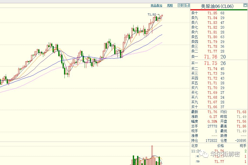 (原油日线图——微信公众号华尔街解密) 目前的原油价格处于高位,中期布油已经涨到之前提及的80关口,中期目标位已经兑现,后期不建议再追高,目前需要做的是关注市场的变化,调整仓位,目前的格局,原油再大幅表现的难度在加大,需要密切注意追高风险。