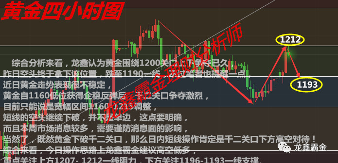 综合分析来看,龙鑫认为黄金围绕1200关口上下争夺已久,昨日空头终于拿下该位置,跌至1190一线,不过笔者也提醒一点,近日黄金走势表现很不稳定,黄金自1160低位获得企稳反弹后,千二关口争夺激烈,目前只能说是宽幅区间1160-1215调整,短线的空头继续下破,并不是单边,这点要明确,而且本周市场消息较多,需要谨防消息面的影响,当然了,既然黄金下破千二关口,那么日内短线操作肯定是千二关口下方高空对待!综合来看,今日操作思路上龙鑫霸金建议高空低多,重点关注上方1207- 1212一线阻力,下方关注1196-1193一线支撑。 黄金9.6操作建议: