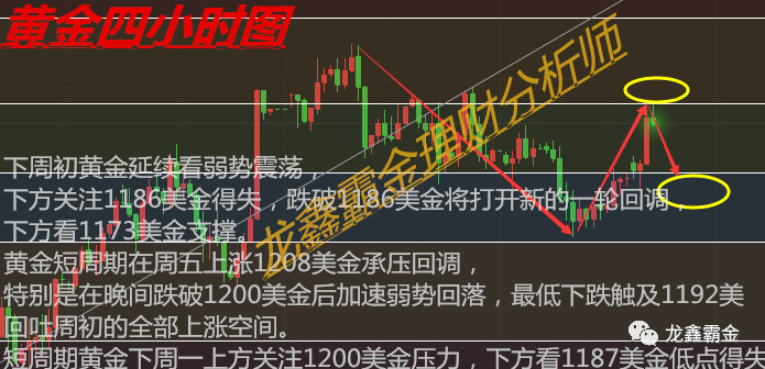 黄金本周整体冲高回落,黄金在周二晚间美盘下探1187美金企稳突破上涨,周四晚间美盘上涨1212美金承压快速回调,周五延续向下破位回落,收盘1193美金,基本回吐前面的涨幅,周线报收一根带上下影线的阴十字星K线。黄金大周期周线走势图分析,周线黄金自上个月下探1160美金年度低点企稳上涨,目前一直低位大区间震荡修正。大趋势黄金看好后期的波段上涨,但是主力肯定不会让大部分人坐上“顺风车”,还会大区间洗盘震荡,可以逐步分批布局低位多单。黄金四小时图走势分析,四小时图黄金目前高位箱体震荡,1214-1188美金之间来回震荡洗盘,短期难有方向,震荡对待。四小时走势图黄金在周四晚间冲高1212美金承压下跌,周五日间小幅上涨1208美金承压破位下跌,收盘1193美金。下周初黄金延续看弱势震荡,下方关注1186美金得失,跌破1186美金将打开新的一轮回调,下方看1173美金支撑。黄金短周期在周五上涨1208美金承压回调,特别是在晚间跌破1200美金后加速弱势回落,最低下跌触及1192美金,回吐周初的全部上涨空间。短周期黄金下周一上方关注1200美金压力,下方看1187美金低点得失。