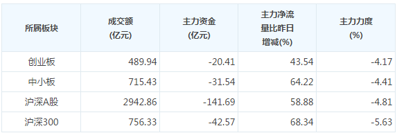 证券时报股市大数据新媒体“数据宝”统计,今日上证综指下跌0.02%,深成指上涨0.03%,创业板指上涨0.35%,中小板指数下跌0.22%。沪深两市、沪深300、创业板、中小板个股主力资金净流量分别为-141.69亿元、-42.57亿元、-20.41亿元、-31.54亿元,分别比昨日增减58.88%、68.34%、43.54%、64.22%,其中创业板主力资金净流量力度最大为-4.17%。