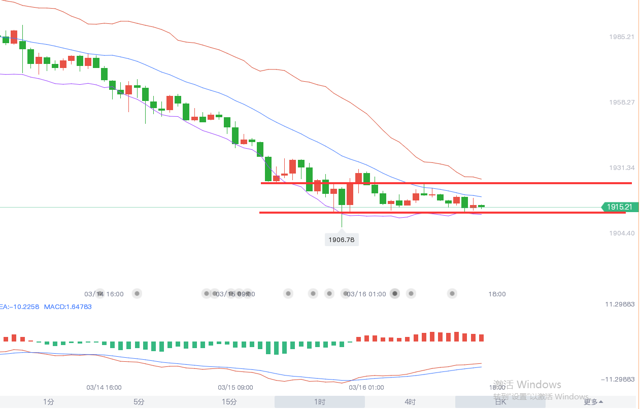 小时图上,黄金今日走的小幅度区间震荡,今日早间支撑1914反弹至1925一线,反复突破10均线,且macd零轴下方红柱逐步放量,认为此时处于底部横盘酝酿中,再往下打压空间不太大,因为当价格逼近隔夜低点或破位,对应macd就会形成底背驰而支撑拉升;另外,原油和黄金近期走势很雷同,原油已展开一定反弹修正,而黄金还处于偏低位,也存在滞后性的概率;同时,按照通道法则来观察,1911-12上是存在趋势支撑的,短期阻力关注中轨1920,能有效突破站上它,届时下行通道的上轨阻力1930上下位置就是关键了,凌晨高点也是1931,这里的得失情况会决定短期反弹修正的力度大小问题;冲上去,则会偏强修正至1950下;而冲不上去,则维持1930下方偏弱修正;文章建议和思路仅能为你提供一个暂时的方向,至于每天的进出场点位和解套时机还是以实盘为准、添加【**:ZJJ831003、QQ:809718881】实时为你指导