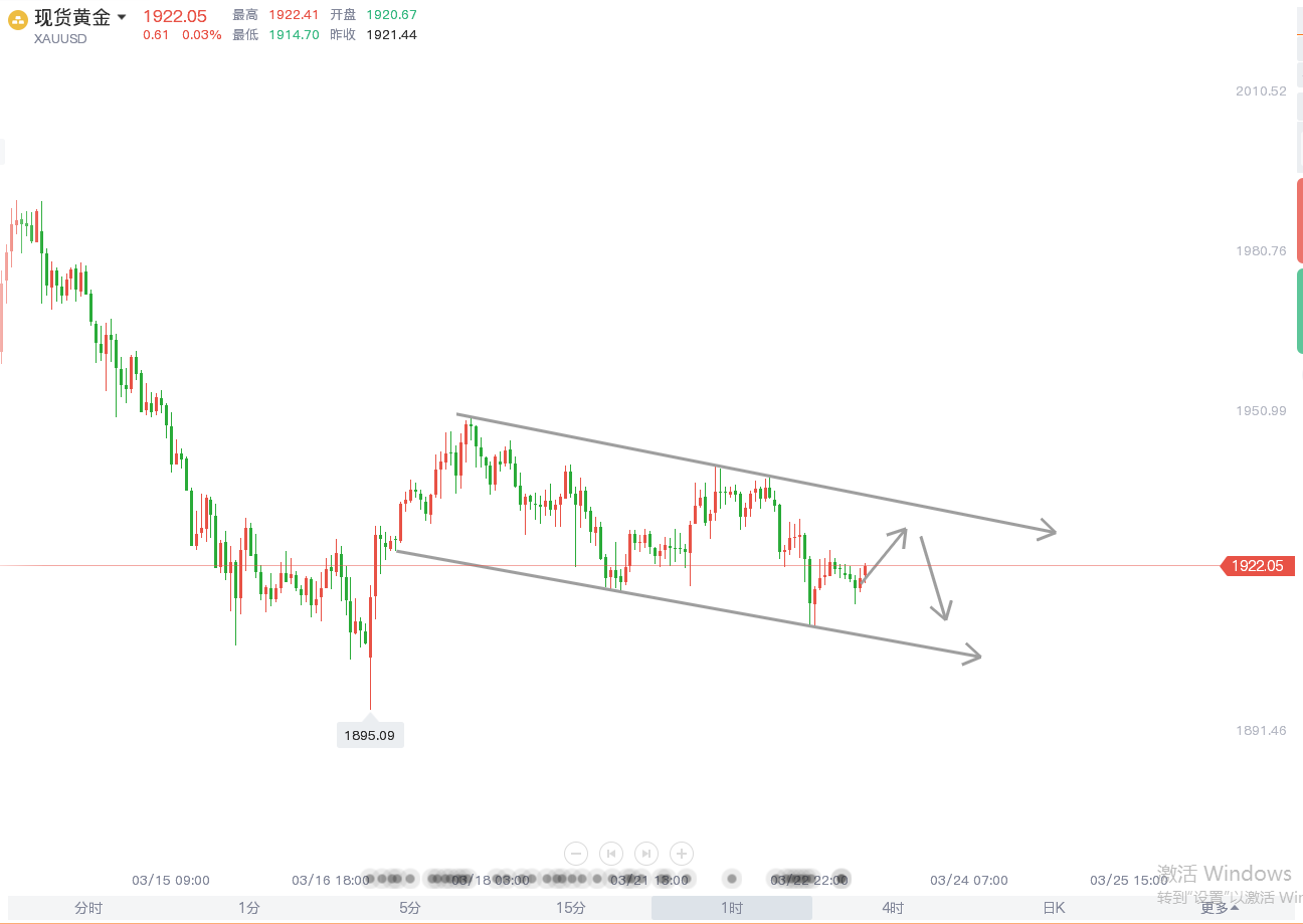 日线最终以带下影阴线收线,但是实体并没有破位,今天倾向收阳,日线实现阴阳转换,也不排除行情在低位震荡一段时间,结构上前面我分析过的看多观点继续保留,基于这一观点,那么低位我们依然参与多单,短线空单保持谨慎;支撑:日线支撑1910一线,考虑到弱K结构,低位接多建议在1910下方参与,黄金下方触及1902-1903一线做多,止损放在1895,目标点位1920-1925,也就是下方即使破位,也是看好虚破走反弹;上方就比较简单了,1938之下做空,黄金若是有效站稳1930,确立震荡,能够站上1938那么多头还将爆发,上方反弹触及1932-1933一线做空,止损放在1940,目标点位1915-1920;短线结构上操作就比较直观了,黄金由三角震荡收敛破位没走出方向,目前转换成偏弱结构的震荡式下行通道,按照通道做即可!文章建议和思路仅能为你提供一个暂时的方向,至于每天的进出场点位和解套时机还是以实盘为准、添加【**:ZJJ831003、QQ:809718881】实时为你指导