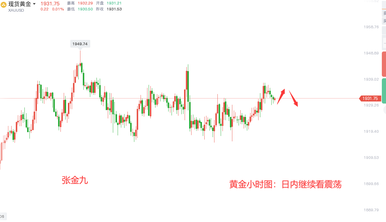 日内点位方面留意,上方实体部分1940一线,影线部分1945一线触及,下方关注昨日的波动震荡周期较长的点位1920一线,以及下方触及的1915一线支撑。趋势结构依旧较为明显,低位触低之后反弹,反弹但是伴随回落,修正式的慢涨形态,而交易时间来到周五,防止两边走势的波动规律,日内以区间高低点布局为主!总的来说,短期走势较为明显的是震荡修正,来回波动,反反复复,以上一个交易日的关键点参考,综上所述,今日黄金操作思路上建议回调做多为主,反弹做空为辅,上方重点关注1945-1950一线阻力,下方短期重点关注1920-1925一线支撑。目前仓位上有单的朋友,由于笔者不知道你们套单的点位以及仓位的详细情况,不好给出相应的解套策略,需要解套的可加张金九【**:ZJJ831003 QQ号:809718881】