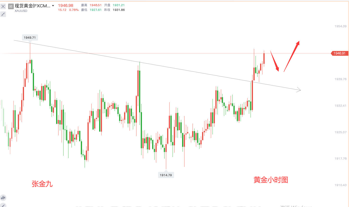 横盘了一周,昨晚终于涨了一波,但是依旧没摆脱大区间。不过日线收的还不多,下周还有高点。周线阴阳转换,下周也要防止阻力出现回落。周线阻力1959附近,不破可以空。只有再次站稳1959才能继续看1970-1980甚至2000,否则还会回落。支撑1924附近,触及可以多,也就是周线重点关注1924-1959区间。日线昨天实体阳线,支撑1930,要想涨不会再回落这里。4小时支撑在1941附近,也就是行情要想上涨会在1941上方先拉一波。顶底转换的位置在1938也是很关键的支撑,一旦跌破1938行情就走震荡了。目前仓位上有单的朋友,由于笔者不知道你们套单的点位以及仓位的详细情况,不好给出相应的解套策略,需要解套的可加张金九【**:ZJJ831003 QQ号:809718881】