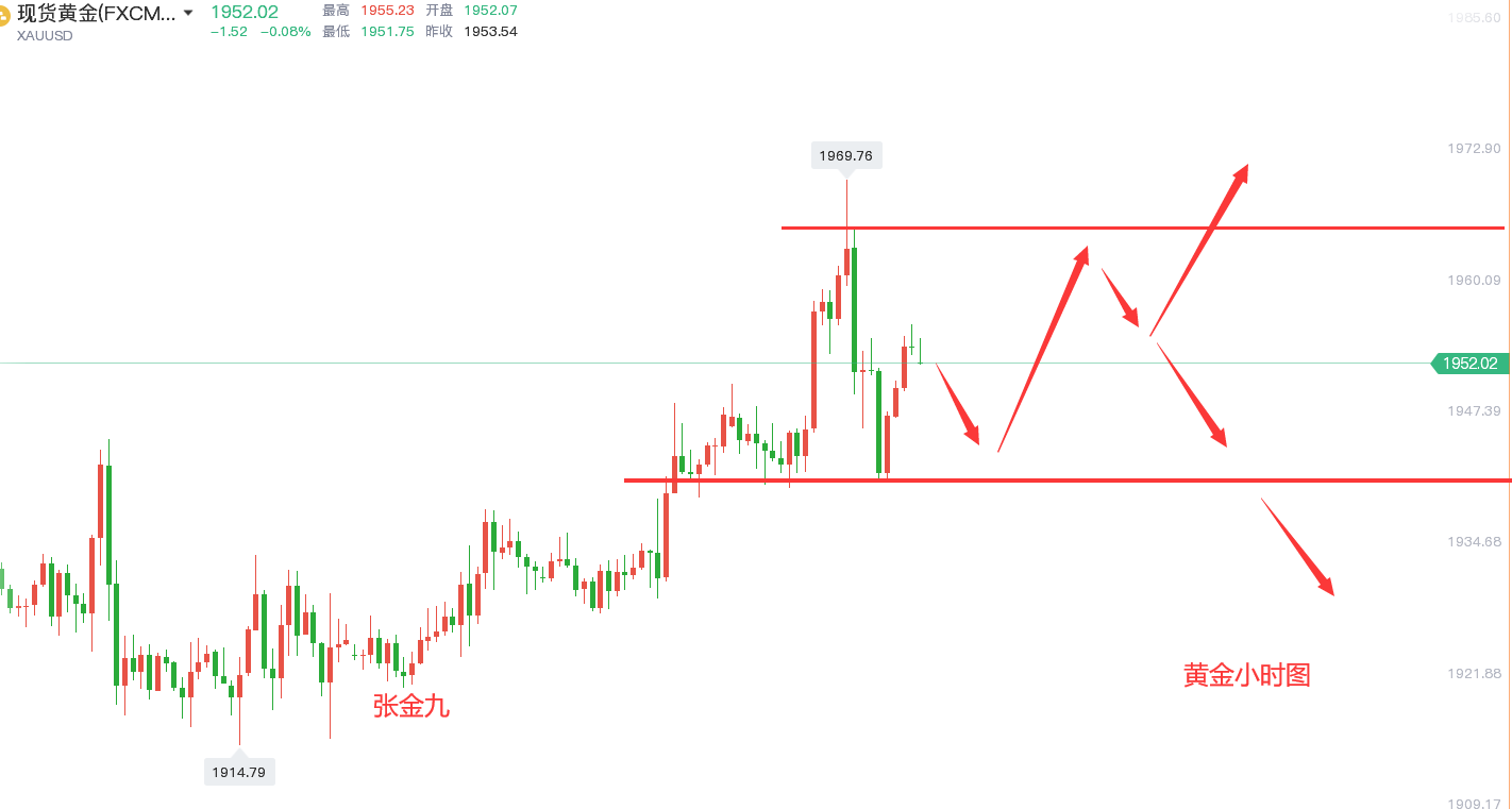 当然,如果说需要做一个趋势偏向,我个人还是比较看好回撤为技术修正,根据短线结构来看,行情破位1950后,短线走势已经呈现反常的运行状态,目前来看那么市场情绪有所降温可能会再次试探日内低点,而如果基本面不出现明确利好,那么技术上的调整需要可能会增强,届时下方或可关注1943-40附近密集支撑测试。黄金当前属于突破底部盘整后的上涨波段,上涨刚刚开始,低多仍是我们的主思路!当前的行情回落到1950下方,但是仍在1940上方蕴量,接下来的压力还是关注1965位置。操作上建议低多看涨为主,反弹高空为辅,接下来黄金可能会走一个震荡上行,区间在1940-1965。目前仓位上有单的朋友,由于笔者不知道你们套单的点位以及仓位的详细情况,不好给出相应的解套策略,需要解套的可加张金九【**:ZJJ831003 QQ号:809718881】