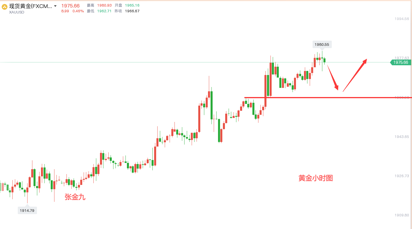 以目前日线以及小时图结构来看,1980一线暂时是可以起到一定压制作用的,晚间行情也出现一定的承压表现,所以晚间思路还是参考技术走势,看承压调整回修预期,上方只要1980一线还存在压制作用。短线行情就会有技术回修调整需求,下方先关注1963-60一带测试。目前仓位上有单的朋友,由于笔者不知道你们套单的点位以及仓位的详细情况,不好给出相应的解套策略,需要解套的可加张金九【**:ZJJ831003 QQ号:809718881】