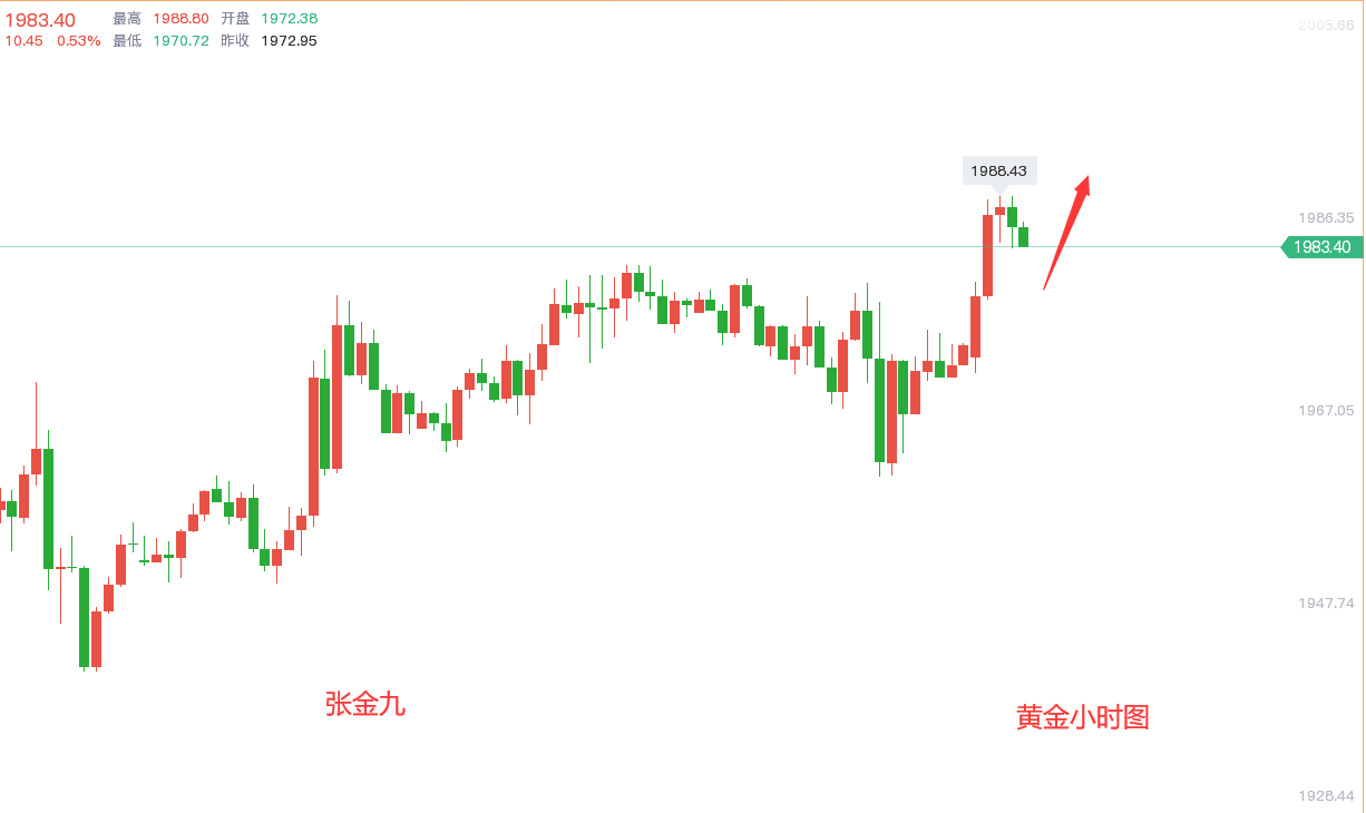 今日周一,黄金价格依托1970关口向上突破高点冲刺1988.5区域。