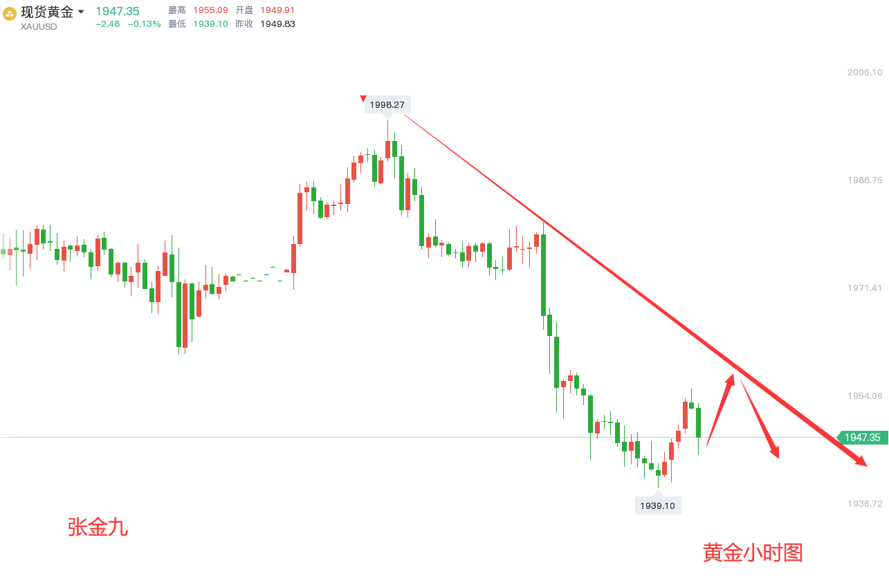 黄金目前有两种结构,第一种大结构:黄金目前走的是1998高点的调整结构,黄金从1890上涨至1998一线,有100多美金的涨幅,中途有单边、震荡、三角收敛但就是没有大型的回踩调整结构,目前1998回踩最低给到1939一线,这波行情可以视为调整,从大结构来讲,调整还未结束,后期预计还会低点,成交密集区在1920-1930区域;第二种结构中期结构:黄金至1998回踩触及1939一线,可以视作这波调整的第一个波段,第一波段走完以后,中途会有反弹修正,因为即使再强势的空头,一根阴K到底,那也是不可能的,所以若1939低点成立,黄金短期还会有继续向上修正的动作,目前高点1955,也才修正了15美金,上方还有空间。综合这两种结构,回归到我们操作上来,上方反弹触及阻力区域继续做空,下方探底做多;做震荡式下跌结构、高点继续调整、低点反弹修正。目前仓位上有单的朋友,由于笔者不知道你们套单的点位以及仓位的详细情况,不好给出相应的解套策略,需要解套的可加张金九【**:ZJJ831003 QQ号:809718881】