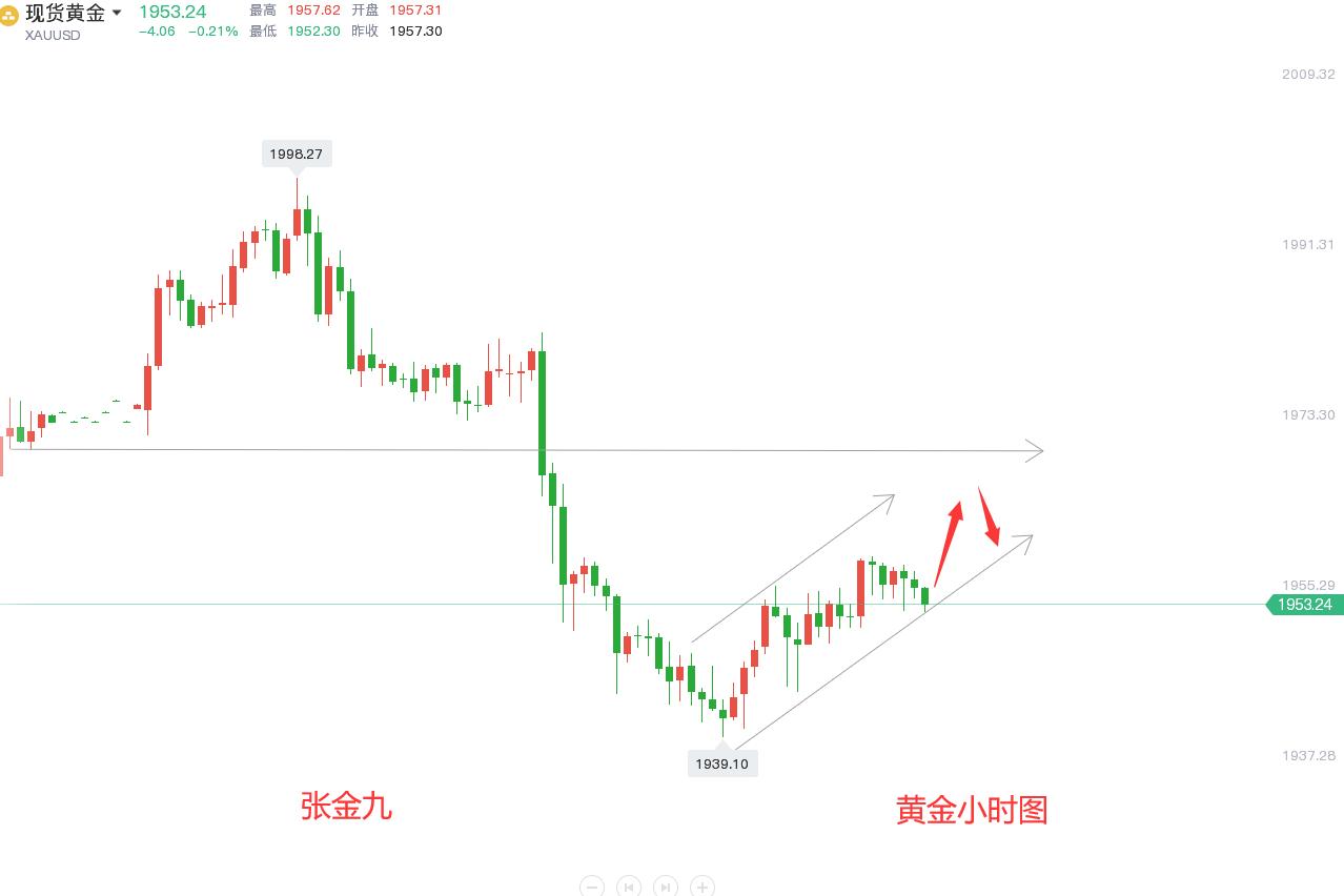 黄金目前结构分析:第一种:大结构1998高点的调整依然会继续,后续还会有低点(破位1939)。第二种:中期看1939的反弹修正,这个两种结构观点依然保留;昨天盘中连续性做多,主要做的是1939的反弹结构,只不过盘中波动节奏太过缓慢,并且临近尾盘,因此提前离场了,不过走势还是符合分析预期,最高触及了1958一线;回归到我们操作上来,还是先做中期反弹修正结构,沿着这个反弹上行通道做即可,考虑到昨日收盘在高位,短线还是上冲动能,阻力区对比昨日尾盘适当放高,上方阻力1970区域,黄金能给到靠近1970的位置,那么1939的反弹修正走过了30美金的空间,对于修正来讲,空间基本已经到位,1970也是一个顶底转换位置,同时给到1970,也是1998下跌至1939反弹的0.5位置,综合分析今日靠近此位置,做空单布局,做第一种结构继续看大调整;目前仓位上有单的朋友,由于笔者不知道你们套单的点位以及仓位的详细情况,不好给出相应的解套策略,需要解套的可加张金九【**:ZJJ831003 QQ号:809718881】