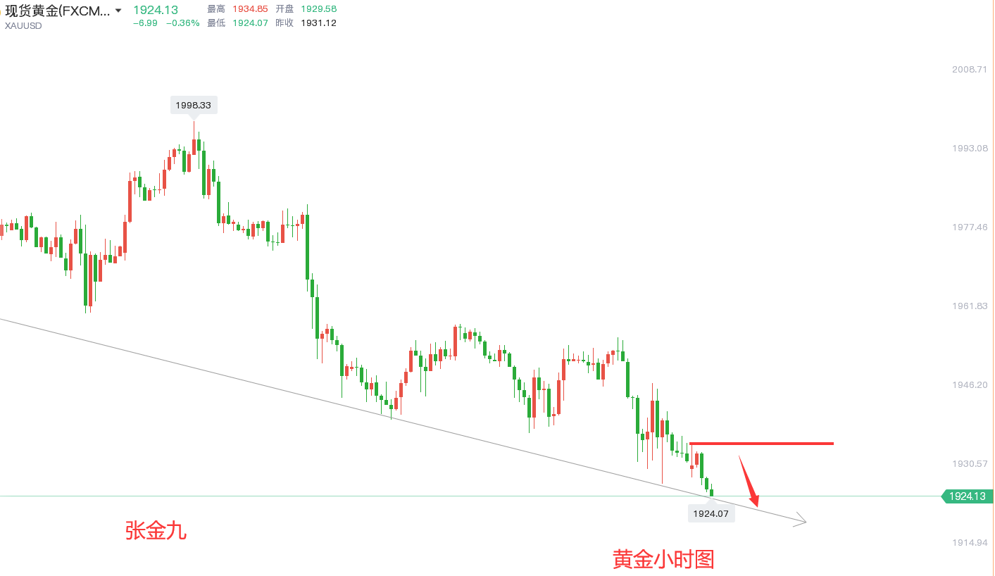 那么这里反弹确定的阻力点1946-1947便是本周的第一道分界线压力,其次就是上周五提及的趋势线的分界线和顶底转换的1958-1960范围。下方支撑关注趋势线沿线位置1915也是前期的依托起涨点范围,中间隔着一个1924的支撑点,继续往下便是1908呀,以及1890区域了。上周五尾盘黄金低位横盘1930关口结束当天的行情,今日周一开盘,价格继续保持低位横盘震荡走低。目前仓位上有单的朋友,由于笔者不知道你们套单的点位以及仓位的详细情况,不好给出相应的解套策略,需要解套的可加张金九【**:ZJJ831003 QQ号:809718881】