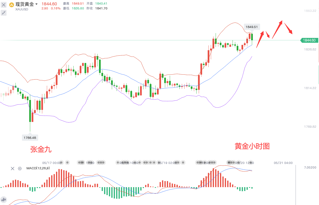 今日方面,前一日大涨,凌晨修正,原本计划两点:早间修正,午后看续涨,特别是欧盘,因为昨日是在欧盘发力的,所以计划是欧盘前做多。选择的位置是昨日上升回撤382位置,也是续涨位,在1833-4一线。另外一方面,欧盘前上升,小时线连阳,价格测试昨日凌晨高点1849一线。相对于这种形态,就要看欧盘点走势了,昨日在这个走势中发力修正,然后美盘8点快速爆发。而按照现在的走势,就是看欧盘点能否有效突破高点,而不是压制回撤。只有突破,才是美盘看多,而要是压制了,反而不容易上升。目前仓位上有单的朋友,由于笔者不知道你们套单的点位以及仓位的详细情况,不好给出相应的解套策略,需要解套的可加张金九【**:ZJJ29921,QQ号:809718881】