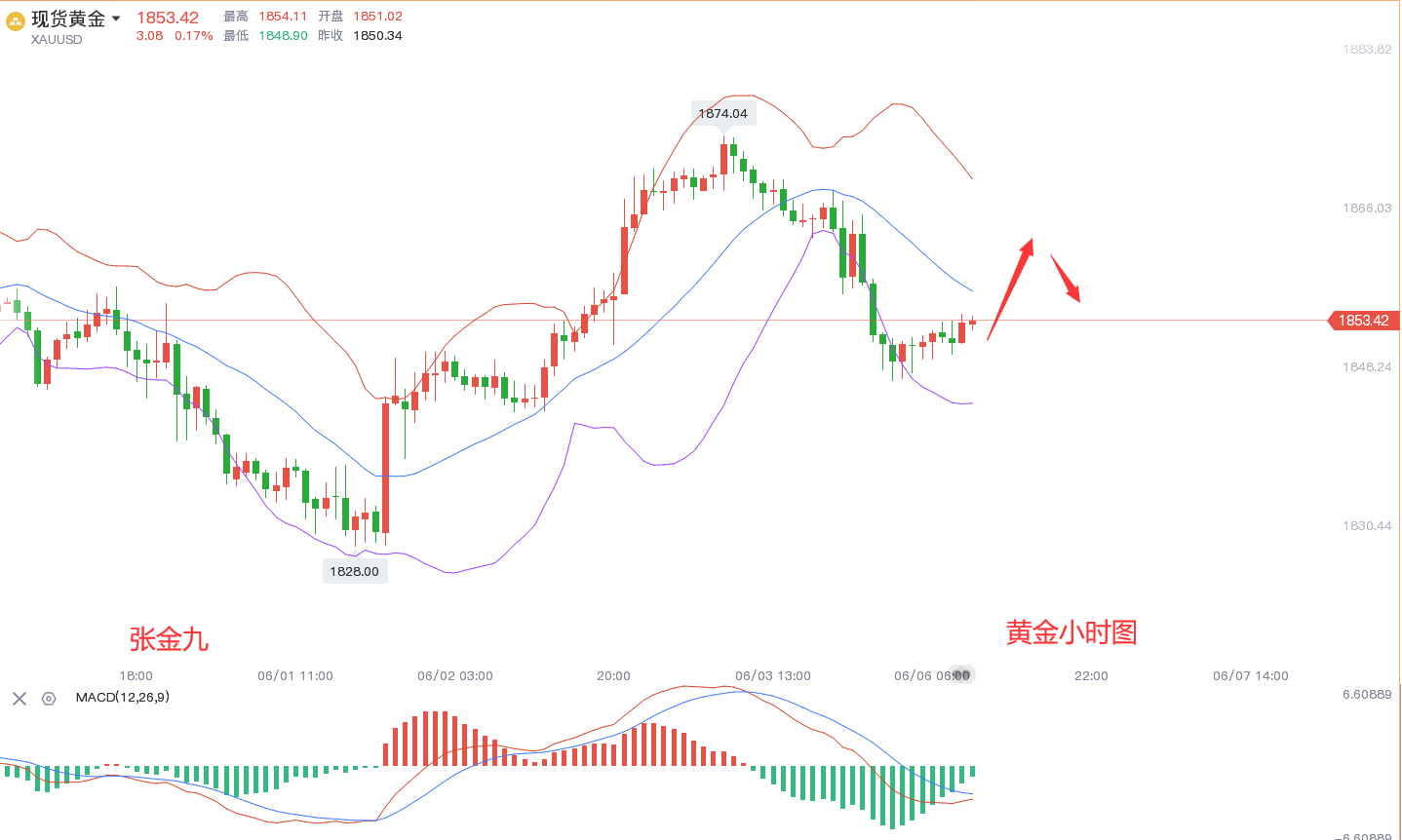 六月第一周非农数据周,黄金先涨后跌,特别是上涨延续变盘,周五非农下跌延续变盘,形成震荡区间,整体没有走出1874,1830的大环境,因此,近期黄金在6月加息消息之前难有较大作为,预计还是区间震荡,本周黄金走势比较明显,各周期都是收口表现,走不出太大范围的波动,交易关注小周期变化即可,目前可以看到的技术面表现还是震荡。本周市场需关注美国5月消费者物价指数也就是通胀CPI数据,上周的非农就业数据报告表现靓丽,增强了美联储加息的信心,若本周的通胀数据仍是表现靓丽,开始高位回落,那么下周美联储利率决议或将宣布更加激进或是更长的加息路劲,从而实现刺激经济,增加就业和抑制通胀的目标。因此本周需要重点留意。