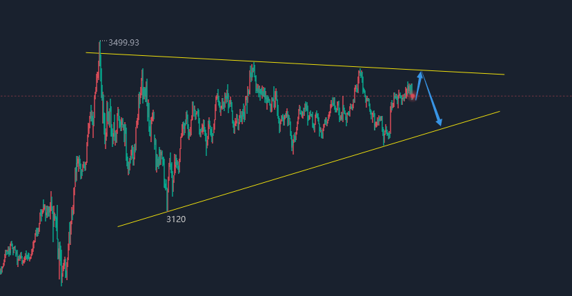 若强势反弹不排除还要去3400关口及上方,但是不能破日内以及上周高点,一旦突破那还是要再涨一波,如冲击3430~40区域,甚至向上突破测试历史新高。说了那么多,就是告诉大家,当前多空都非单边,就是无序的超级大扫荡走势。