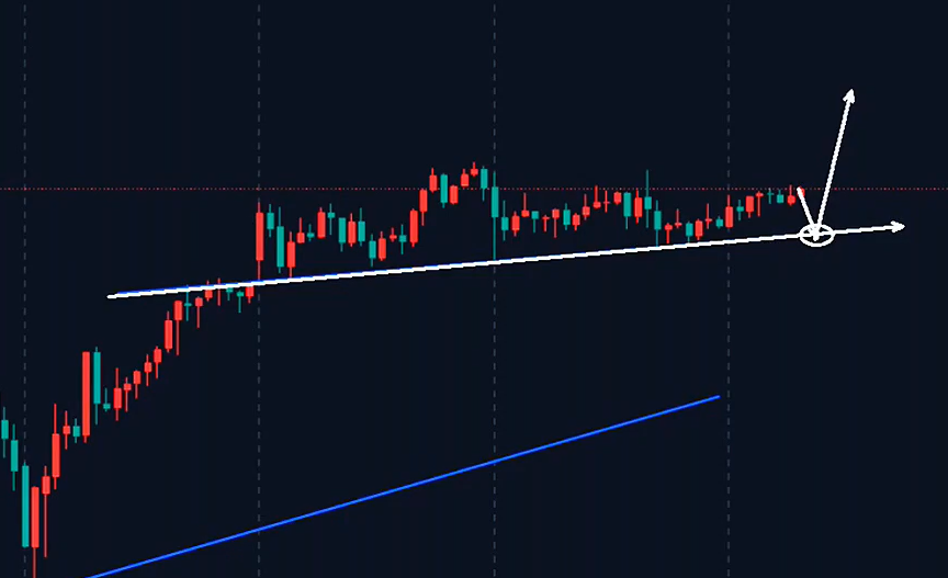 这个我们从小时线上来看会更明显一些,在下方形成一条很明显的趋势线支撑的结构,今天如果再次回撤触及这个支撑线,还是可以继续看北上的,目前来看大概在5010—5020区域。
