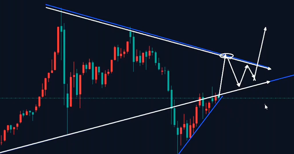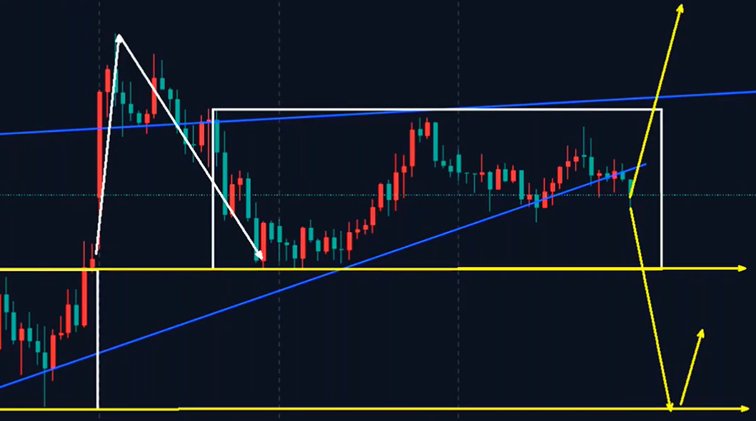 如果突破了压力线,就会去到上方的三角收敛结构内,那么进一步去挑战测试5100的概率就很大,也就是三角收敛的区间上沿,然后再选择方向突破三角收敛的结构。