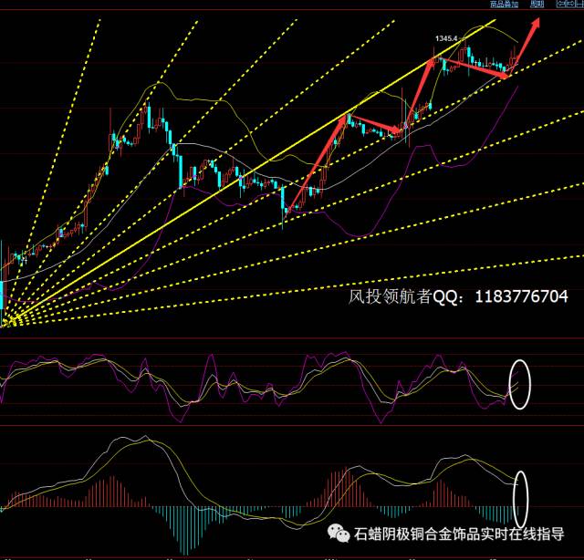 美黄金: 黄金从小时线来看,自昨日黄金开盘高开近8美金后,行情持续在高位,虽有回落,但从上图可以很明显看出,其自此前几日的行情之后,价格在江恩角度线中形成了一波完美的阶梯式上行,经过昨日高位盘整,价格即将进入第三浪上升期,且上方基本无压力位,所以本人日内基本全线看多,且看上图下方KDJ和MACD比原油之涨势要来的更加之猛,如果判断没错,本人日内建议如下: 1、 回落1338.0进场多单,止损1337.0,目标看1345.0 2、 若强势跌破1337.0顺势追空,止损1339.5,目标看1333.0 3、 若日内见1348.0即可做空,止损1349.0,目标看1343.0 行情皆具有时效性,建议不具时效性,有需要可以找到本人实时* 风投领航者微信:hfzt588 QQ:1183776704