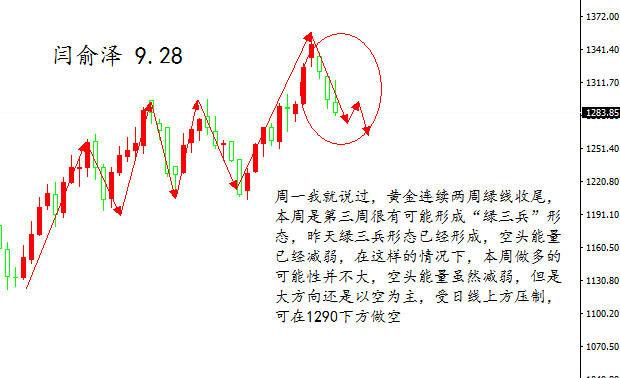 世间最可怜的是犹豫不决的人 你的判断力深植于个性当中,如静水深流。 判断力不应受情感波动、建议、批评以及表面现象的干扰。判断力是处理任何重要事件所必需的。除了事实本身的真实状况外,它不受任何影响。有的人虽然能力出众,却毁于这样一个小小的个性弱点,尤其是当他在其他方面的能力都很强的时候,这是人生的悲剧。今天,成千上万的人虽然在能力上出类拔萃,却缺乏果断的个性而沦为平庸之辈。 要知道,在任何情况下,不能信心百倍地做出自己的决断都是一个悲剧。许多人正是因此遭致失败,而非缺乏能力。 http://si1.go2yd.com/get-image/0H2HhL29Dqy 黄金:周一我就说过,黄金在连续两周绿线收尾,本周是第三周很有可能形成“绿三兵”形态,昨天绿三兵形态已经形成,空头能量已经减弱,在这样的情况下,本周做多的可能性并不大,空头能量虽然减弱,但是大方向还是以空为主,受日线上方压制,可在1290下方做空,行情不到,耐心等待,抄底做多不建议。 想要盈利,果断是关键,别人给你建议,你怀疑,亏损了不止损,你觉得能上去,继续扛着,赚钱了,你担心损,马上止盈,试想,这样的心态你能在这行赚到钱?二八定律你永远进不了二。 本文作者闫俞泽(微信:pxbj88),从事股票、期货、黄金、外汇多年,有着丰富的实盘操作经验,具有扎实的理论基础和实战经验,注重资金管理和风险控制,操作风格稳健果断,如果你做单不顺或投资资金缩水,可以关注本人。投资有风险,入市需谨慎,每天行情波折不断,我所能做的就是用我多年的实战经验,给大家帮助,让您的投资决策和经营管理走在一条正确的航向上。