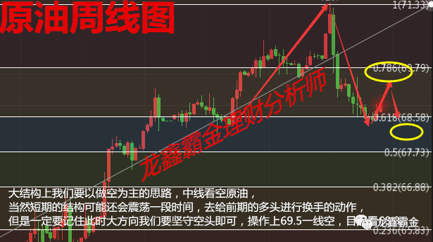 原油从周线图来看,周线以上影线的小阳线结构本周的周线收线,从大结构来看,原油自42一线起涨,42到66.5为一浪上涨,66.5到57.9为二浪调整,57.9到72.7为3浪上涨,72.7到63.6为4浪调整,63.6到75.3是5浪上涨,完成了上涨的五浪,同时一浪比一浪的走势要弱势,这让我想到了黄金的周线自1122的上涨五浪,也是一浪比一浪弱,走到最后,运行一个季度的震荡,随后开启大暴跌的走势,同样此时原油的上涨也是雷同,当前原油就是处于高位震荡的走势,此时的高位震荡就是为了前期赚钱的多头的出逃准备时间,一旦出逃换手完毕,原油必将迎来黄金式的大暴跌,从时间周期来看,也就是在最近两个月时间内,原油必将迎来暴跌的走势,大结构上我们要以做空为主的思路,中线看空原油,当然短期的结构可能还会震荡一段时间,去给前期的多头进行换手的动作,但是一定要记住此时大方向我们要坚守空头即可,操作上69.5一线空,目标看68.3