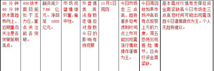 目前上证指数技术面30分钟60风险MACD处于零轴上方动能柱缩短看出短期技术面有回踩需求,但日线级别有五日均线支撑故回踩力度可能较小,从时间上说;明日周五也是11月的第一周是美国公布非农业人口就业数据的时间点故投资者有规避市场的不确定因素需求。操作与昨日观点一致个股持有者不愿承担不确定因素风险可以先出局观望等待市场的趋势确定,指数操作以短线为主中间差价在50点左右。(个人观点 仅供参考)