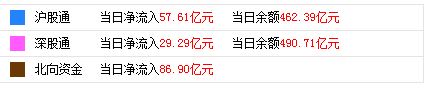 北向资金今日净流入近87亿 创深股通开通以来新高 e公司讯,北向资金截至收盘净流入近87亿,创深股通开通以来新高。其中沪股通净流入57.61亿元,深股通净流入29.29亿元。