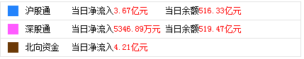 北向资金净流入4.21亿元 e公司讯,数据显示,截至11月27日A股收盘,北向资金净流入4.21亿元。其中,沪股通资金净流入3.67亿元,当日余额516.33亿元;深股通资金净流入5346.89万元,当日余额519.47亿元。