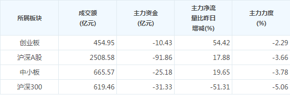 证券时报股市大数据新媒体“数据宝”统计,今日上证综指下跌0.04%,深成指上涨0.25%,创业板指上涨0.83%,中小板指数上涨0.12%。沪深两市、沪深300、创业板、中小板个股主力资金净流量分别为-91.86亿元、-31.33亿元、-10.43亿元、-25.18亿元,分别比昨日增减17.88%、-51.31%、54.42%、19.65%,其中创业板主力资金净流量力度最大为-2.29%。
