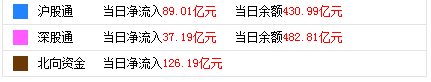北向资金净流入126.19亿元 e公司讯,数据显示,截至12月3日A股收盘,北向资金净流入126.19亿元。其中,沪股通资金净流入89.01亿元,当日余额430.99亿元;深股通资金净流入37.19亿元,当日余额482.81亿元。
