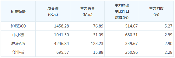今日77亿主力资金净流入沪深300个股证券时报股市大数据新媒体“数据宝”统计,今日上证综指上涨2.57%,深成指上涨3.34%,创业板指上涨3.27%,中小板指数上涨3.70%。沪深两市、沪深300、创业板、中小板个股主力资金净流量分别为123.23亿元、76.89亿元、15.88亿元、31.09亿元,分别比昨日增减339.67%、514.67%、250.96%、680.31%,其中沪深300主力资金净流量力度最大为5.27%。(数据宝)各板块资金流向数据