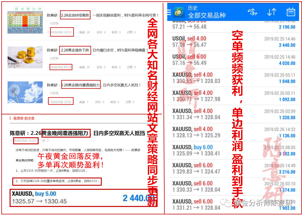 昨日日行情持续震荡中,4小时昨日探高后仍未突破1333高点,整体走势偏弱震荡。早间意研便通知实仓客户空单进场,1332一线阻力难以突破,白天空头趋势逐渐明朗,空单成功获利,晚间行情回落1323一线,意研又通知实仓客户多单进场,目前多单完美止盈,震荡行情,抓住趋势尤为重要。意研文章各大财经网站实时更新,全网可查,意研还是那句话:选择意研就是选择盈利! 全方位指导时间:早上8:00至次日凌晨4:00.