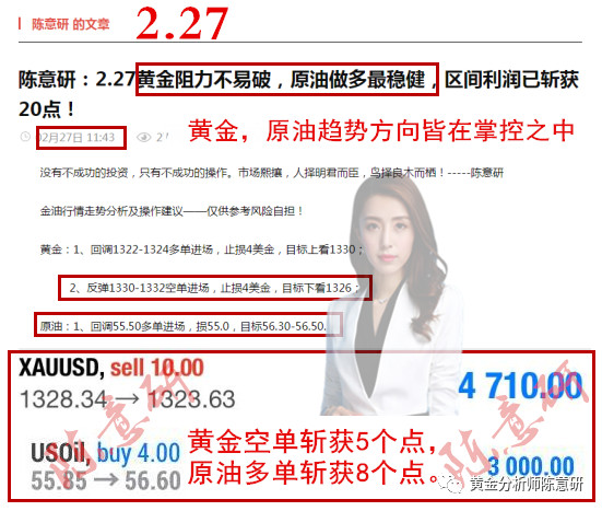 早间黄金,原油早间微小波动,日内维持4美金振幅,晚间行情趋势开始逐渐明朗。原油率先打破僵局,一路上涨不回头,晚间黄金开始逐渐下探。本周以来黄金连续的区间震荡,而且震荡的空间越来越小,今日无论上破还是下破,打破三角震荡的可能性较大。原油今日再度强阳拉升,目前已经非常靠近关键压力56.7位置。意研文章中午强调黄金阻力不易破,原油多单最稳健,随即意研通知实仓客户黄金空单进场,原油多单进场,今日两单成功拿下13个点,盈利可观! ====周初首单赢得10点利润,实仓持续获利中====