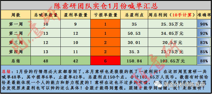 意研常说一句话就是:“稳健操作+平常心=持久的盈利。”意研做单向来以稳健为主,1月份的行情想必大家都看到了,本月意研也是狠狠的抓了一波利润!在这四周里意研一共喊单48单,其中损单6单,止盈单42单,总盈利点150个点,合计103.65万人民币。数据有时候恰恰是最能体现一个人的能力和努力程度的!意研在这也不过多的吹嘘,相信当你见到我时,你就会发现原来盈利也可以帅的这么具体!会跟才能得到慧根,跟随才能学到精髓。我!是陈意研! 一些投资人总存在“不敢输”的心理,当某种投资产品价格上升,赚了差价,高兴的到处说,一跃老高。一旦价格下跌,不停的抖动老师,怎么办怎么办怎么办,总盼望它能很快升起来。你若单打独斗必定会遍体鳞伤,你若不相信意研也没关系,意研用实力和数据说话,2019年新的一年意研在1月份打了一个漂亮的仗,开门红就是好运气的开始,选择意研就是选择盈利!