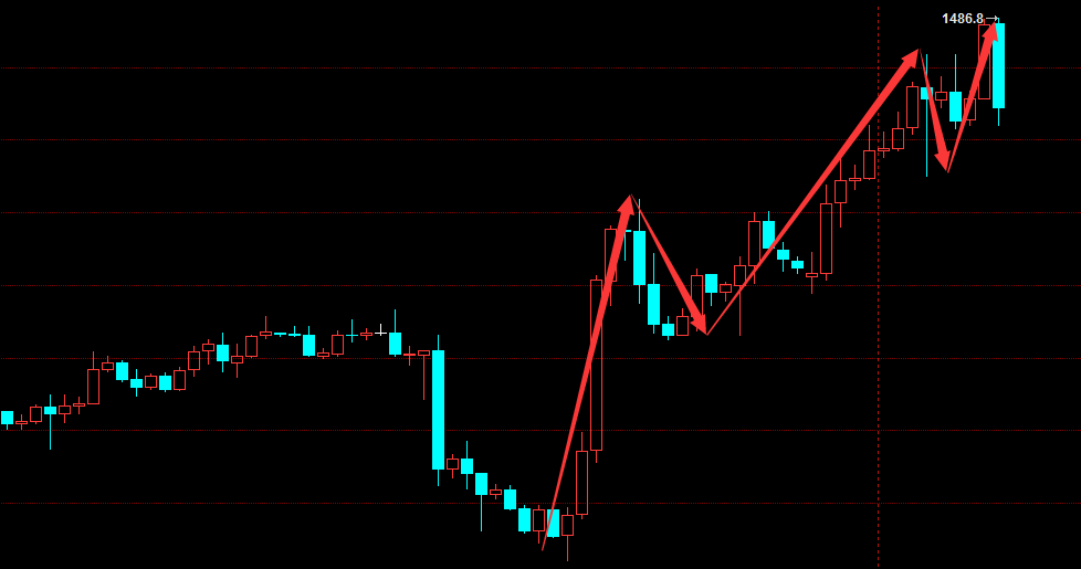 黄金2h图昨天走完一波上涨5浪,后面必跟着一波回调。而且2h图目前走出阴包阳形态,今天建议可以高位做空,下方支撑在1450上方。
