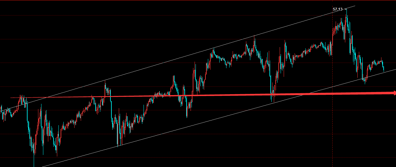 原油昨日本以为凭借EIA数据能突破震荡区间,但是还是摆脱不了震荡的格局,日线收长上影线,而且触及到趋势线压力又继续被打压下来。今天的原油看空为主,下方关注下55.2的支撑,破位的话下看54一线!