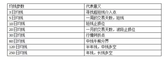 均线是趋势指标中最常用的一种,全称为移动平均线指标,简称MA,简单的说就是连接平均价格点的一条曲线。 在MT4盘面当中,投资者可以根据自身的需要对均线设置不同参数。不同的参数设置均线所代表的意义也是不同的。 常用的均线参数如下: http://si1.go2yd.com/get-image/0asRJAe41Am