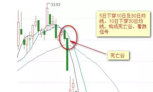 主要特征: 1、出现在下跌初期 2、由3根短、中、长期均线组成 3、时间短的均线由上下穿时间长的均线(慢线) 技术含义:见顶信号,后市看跌 操作建议: 1、汇价大幅上涨后,出现该信号,可积极做空 2、中长线投资者可在周K线或月K线出现该信号卖出 主要提示:两线交叉的角度越大,下跌信号越强烈 银山谷http://si1.go2yd.com/get-image/0asRJGVrZHE