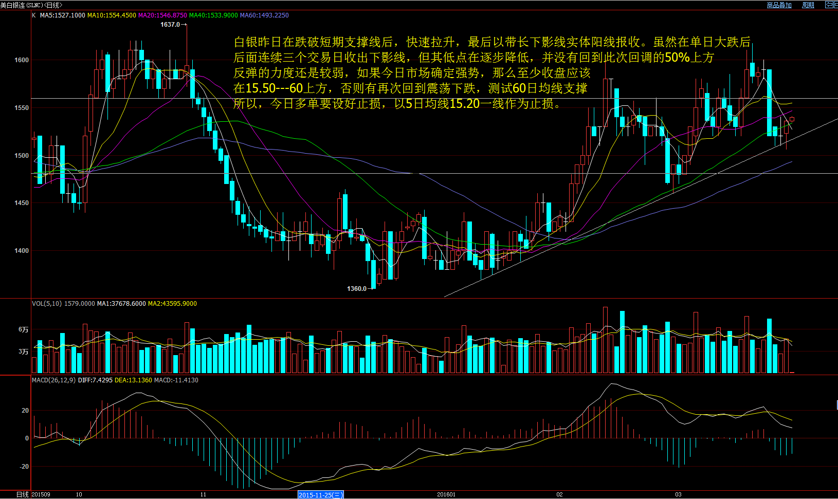 白银价格昨日在跌破短线支撑后快速拉升,最后以带长下影线实体阳线收盘。虽然在前期大跌后,目前已经连续三个交易日收出下影响,但其低点都在逐步下降,并 没有回到此次回调的50%上方,目前反弹力度还是比较弱势。如果今日市场确定回归强势,那么至少收盘应该在15.5~16上方,否则未来仍然有再次震荡下 跌的风险。今日多单要设置好止损,以5日均线15.2作为止损点,跌破此处则后市或继续探底。