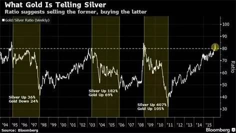 最近从一篇文章中看到金银价格比走势图(如下图),显示20多年来该比值有3次大的波动,每次当该比值达到80以上时都会出现一次回落,而到回落结束时,银价的升幅总是远远高于金价的升幅。如今该比值再次达到80,并开始出现回落,所以买银的时候到了。